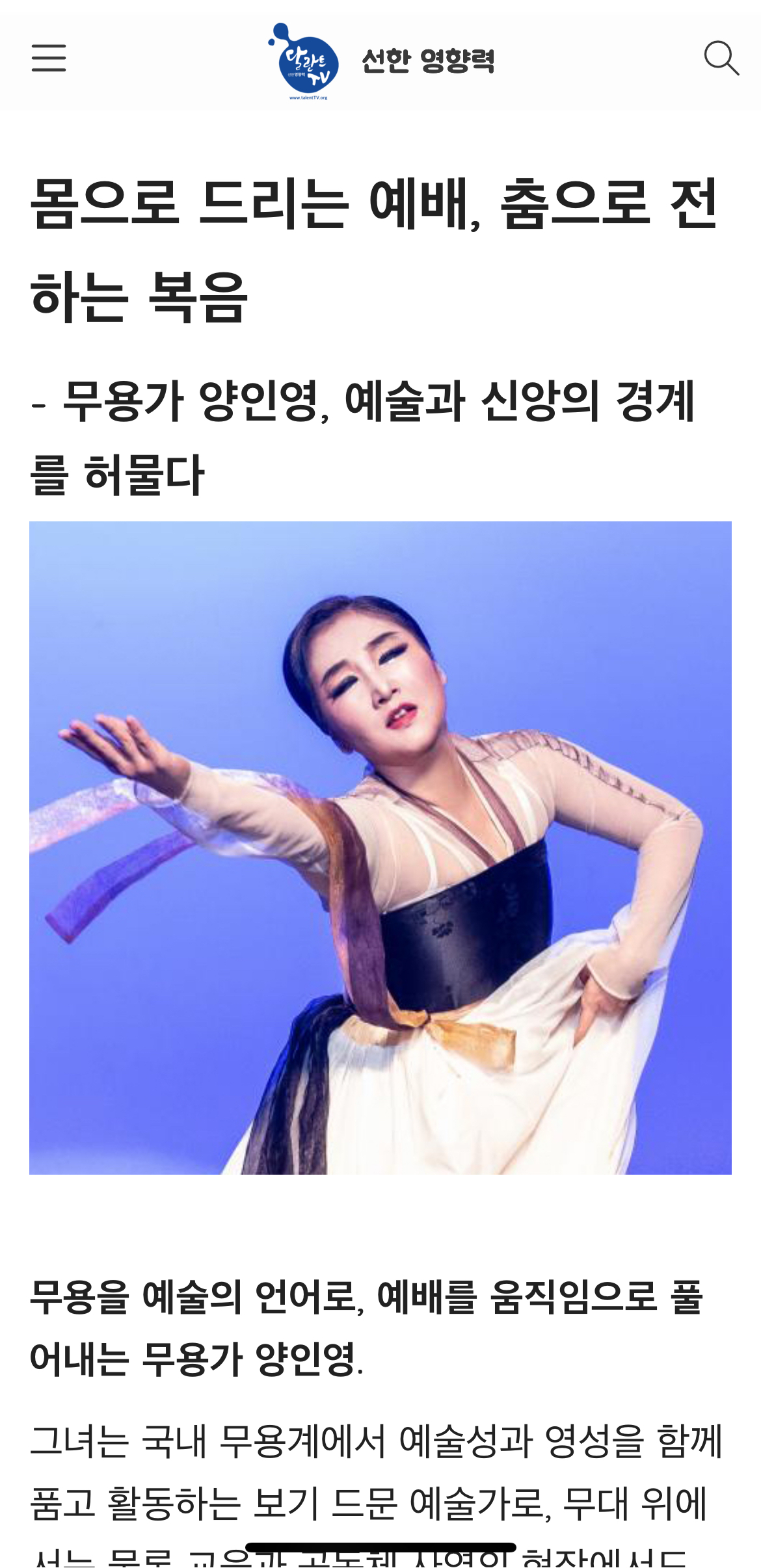 몸으로 드리는 예배, 춤으로 전하는 복음 - 무용가 양인영, 예술과 신앙의 경계를 허물다 무용을 예술의 언어로, 예배를 움직임으로 풀어내는 무용가 양인영.그녀는 국내 무용계에서 예술성과