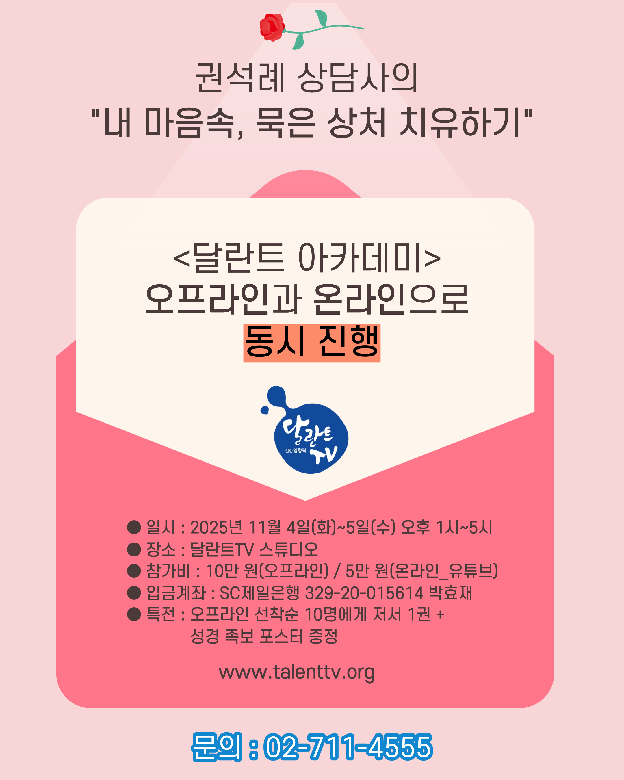 오는 11월 4일(화)부터 5일(수)까지, ‘달란트 아카데미’에서 권석례 상담사의 치유 강의 “내 마음속, 묵은 상처 치유하기”가 오프라인과 온라인으로 동시에 열린다. 이번 강의는 자신도 모르게 마음 깊은 곳에 자리한 ‘묵은 상처’와 ‘증오의 감정’을 직면하고, 치유와 회복의 길을 찾아가는 과정을 다룬다.