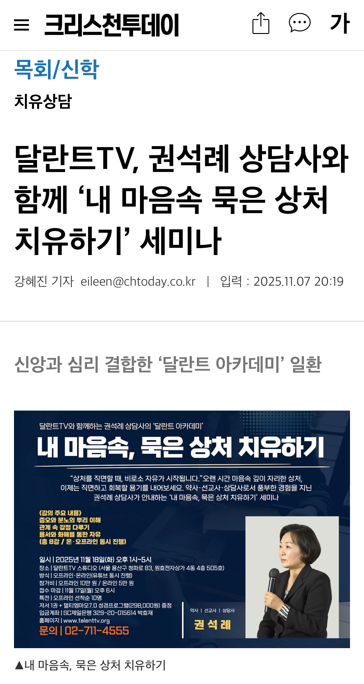 [달란트 뉴스] 크리스천투데이 기사 안내 - 달란트TV, 권석례 상담사와 함께 ‘내 마음속 묵은 상