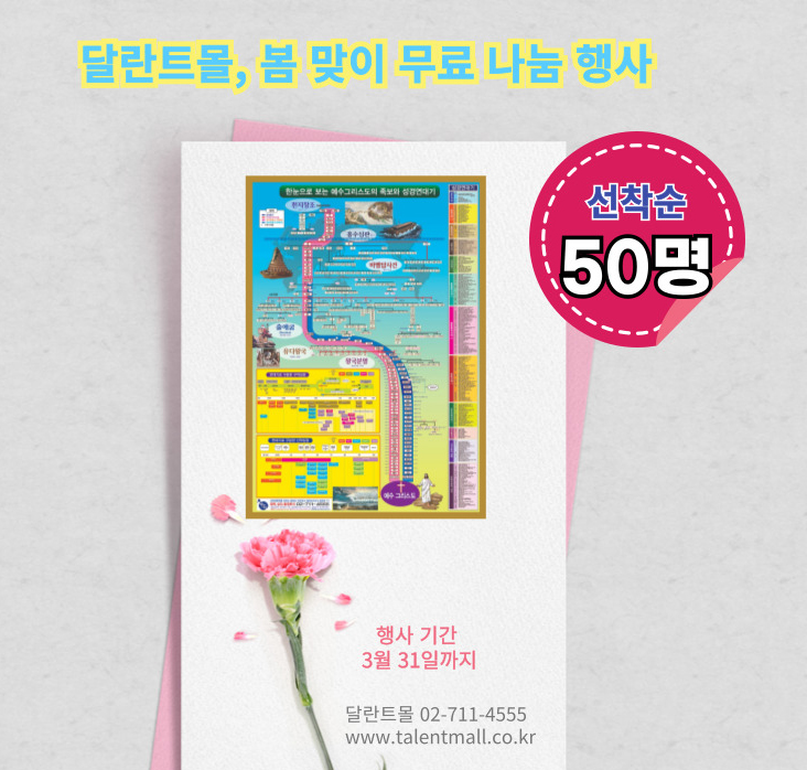 지난달 ‘봄맞이 나눔 행사’ 종료 후, 4월 2일 택배 발송 완료 달란트몰에서 진행한 ‘봄맞이 나눔 행사’가 지난달에 종료됐다.이번 행사는 선착순 50명에게 '예수 그리스도의 족보와 성경 연